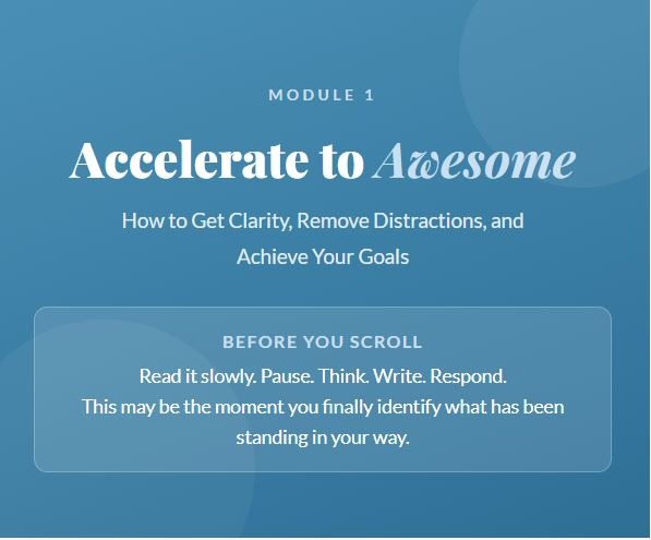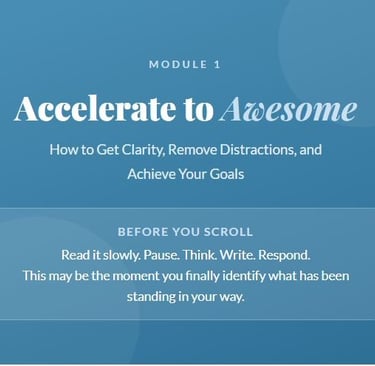 "Accelerate to Awesome is just that -Awesome!....Full of gold nuggest that helped me get on track and move forward with the dream I have for my buiness." Michelle J.